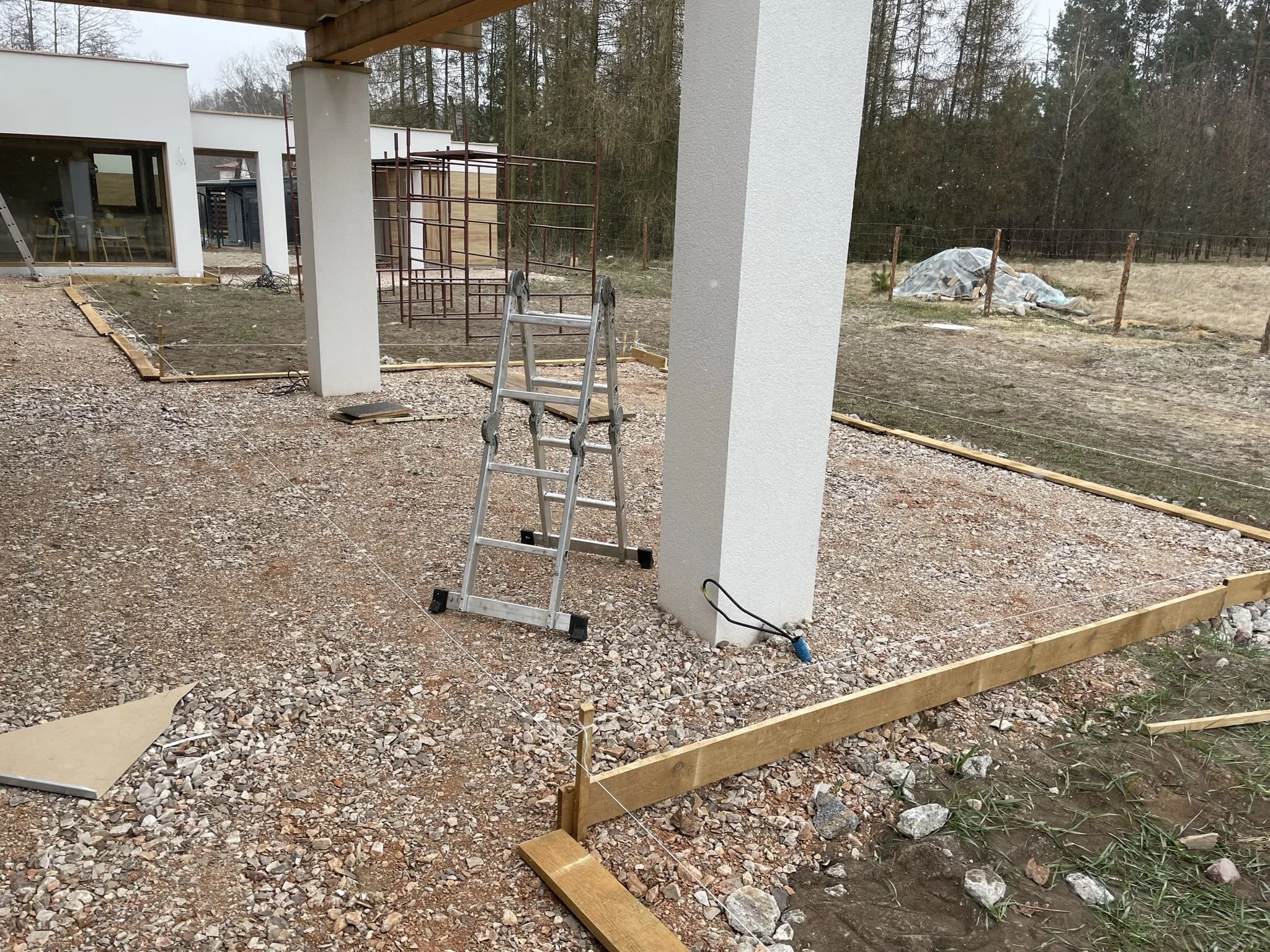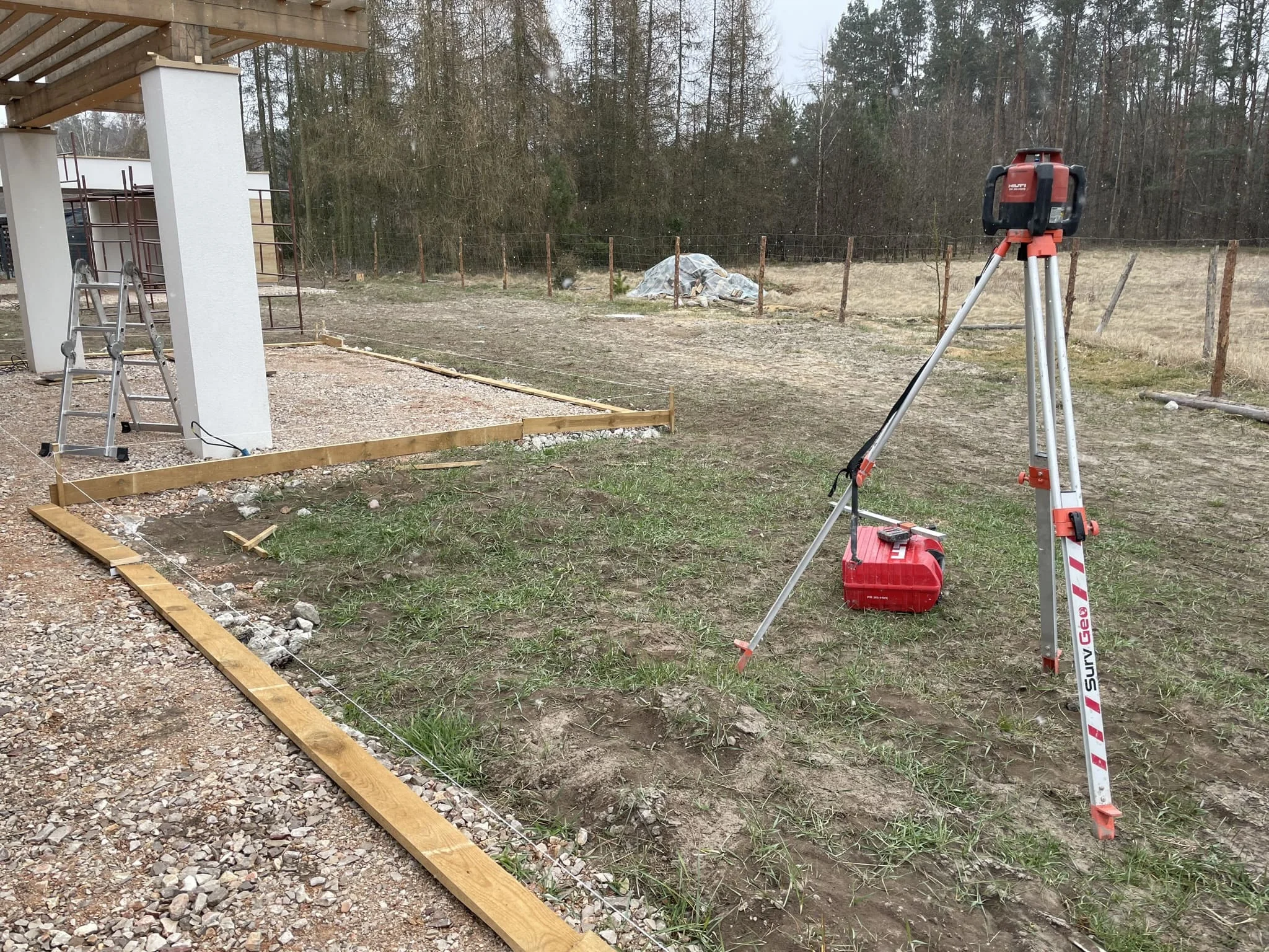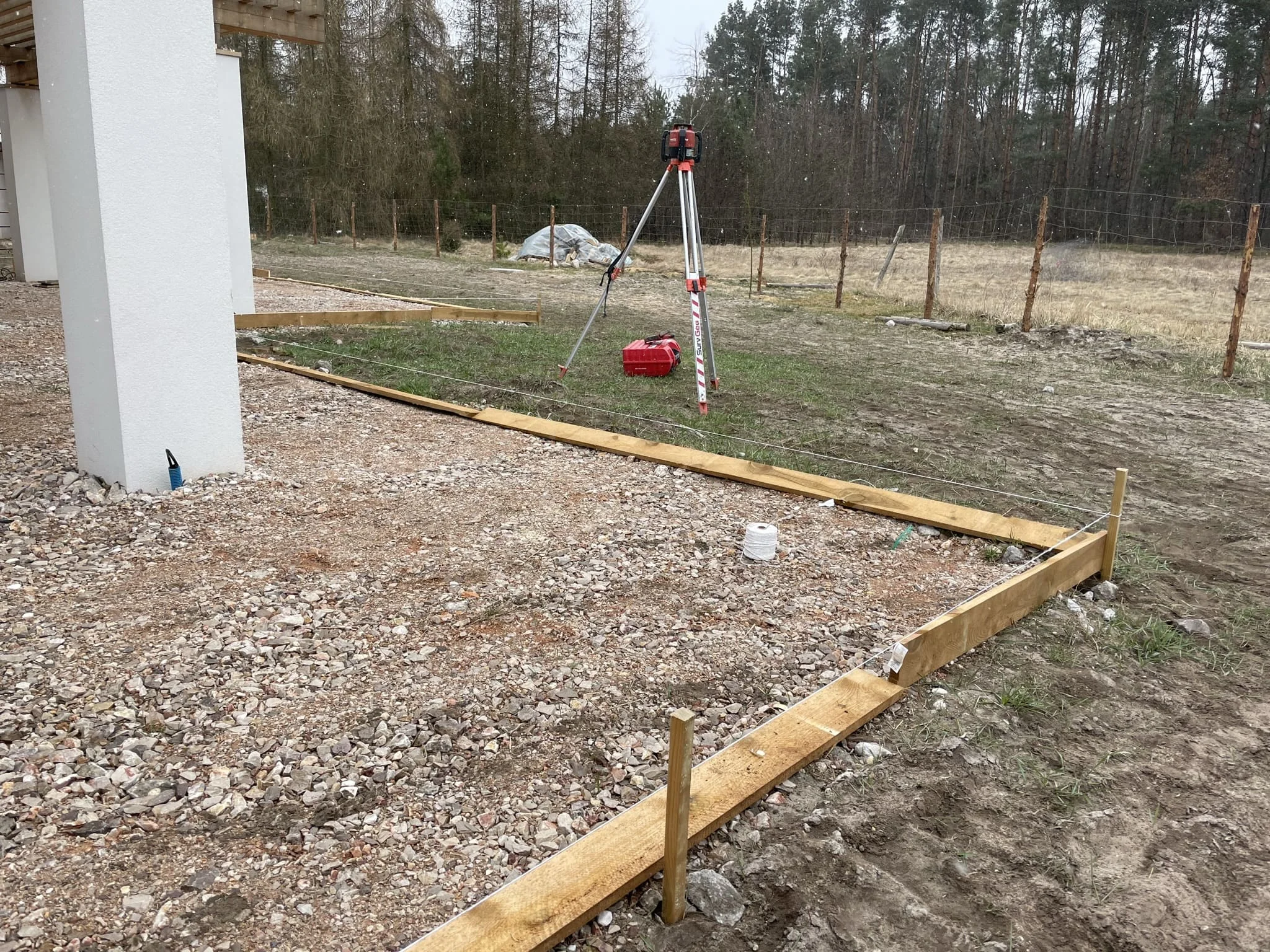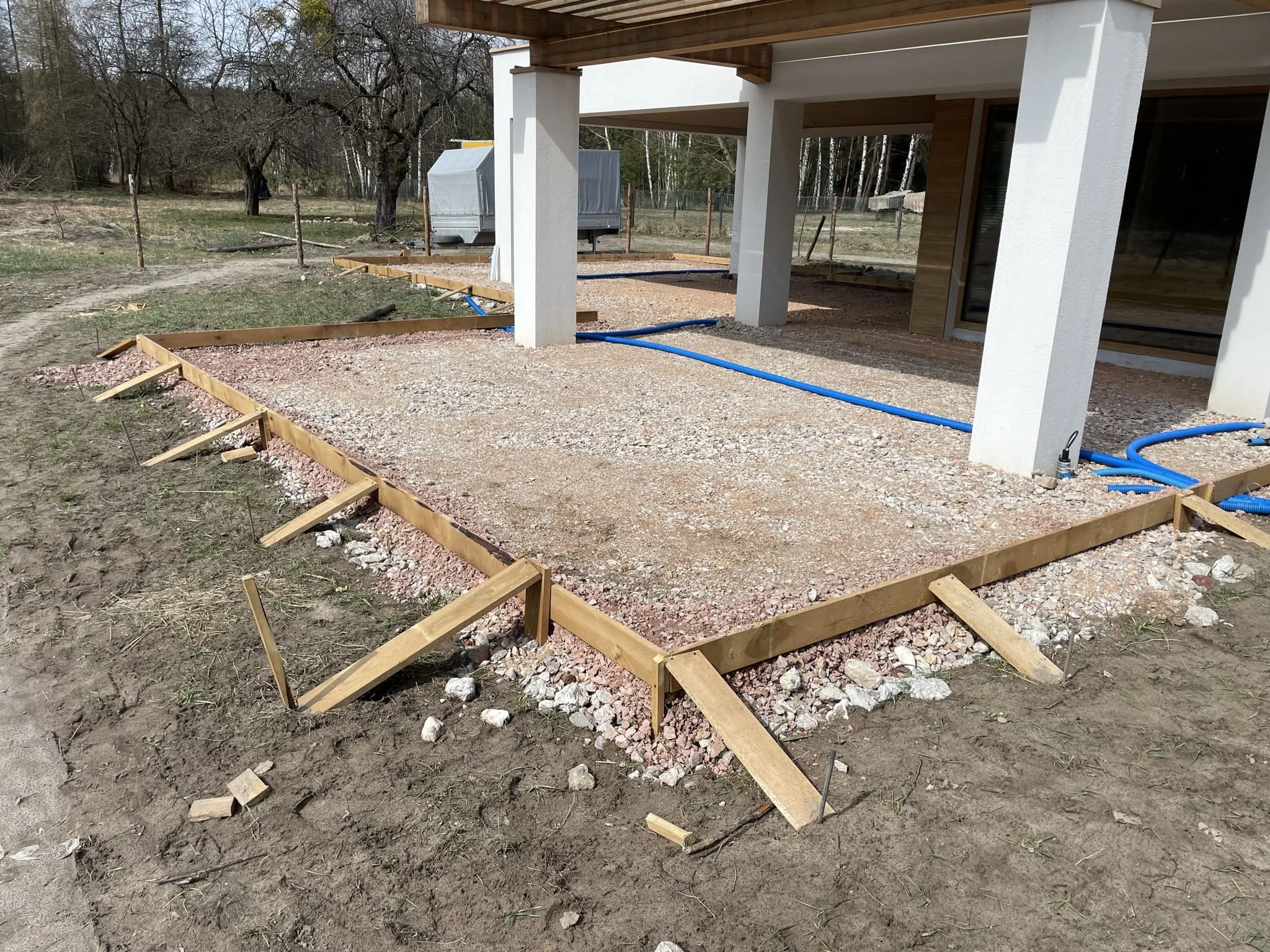 - Подготовка основания: снятие плодородного слоя, послойная трамбовка песка и щебня;