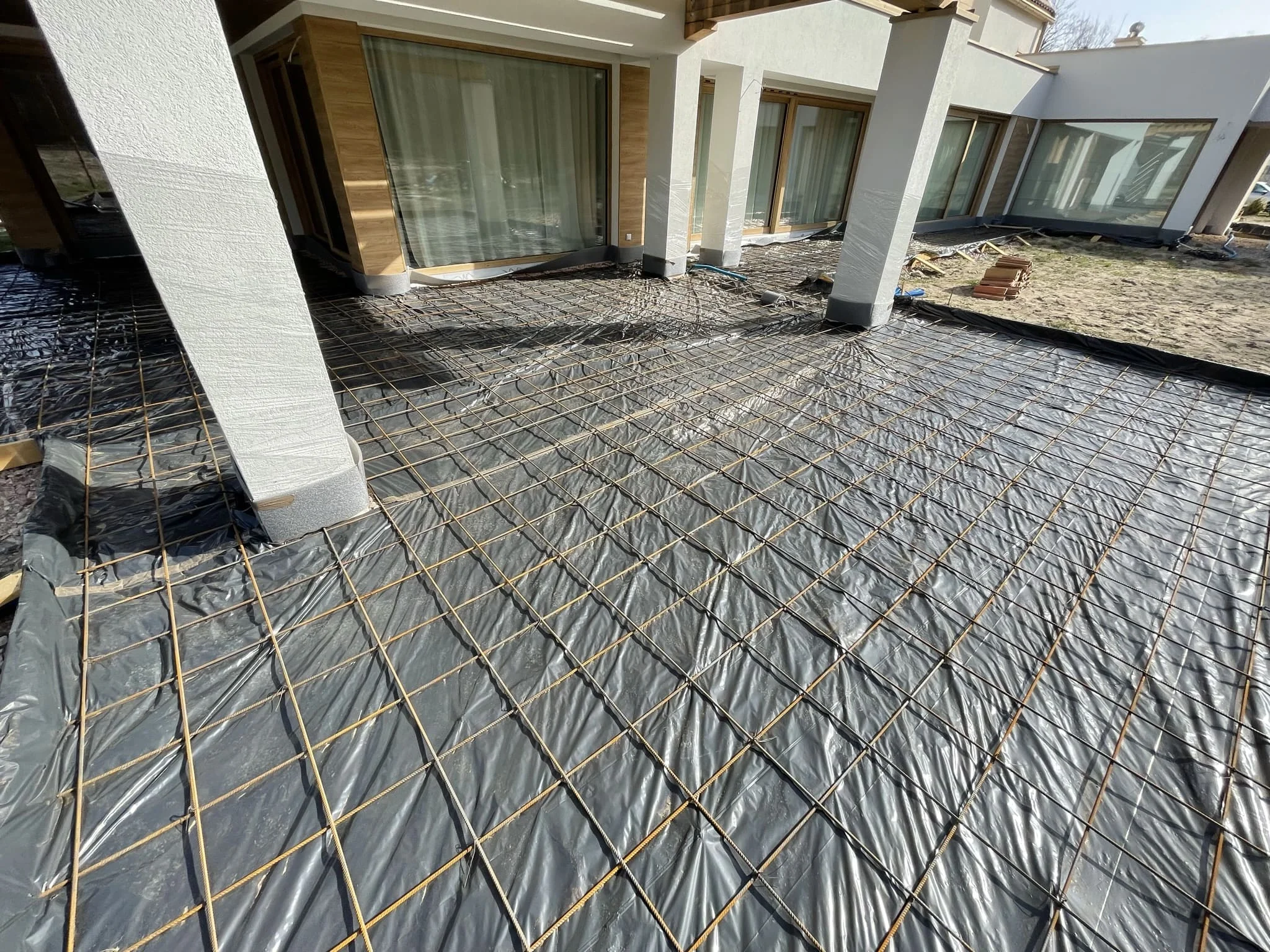 - Армирование: укладка сетки или фибры для распределения нагрузок и предотвращения трещин;